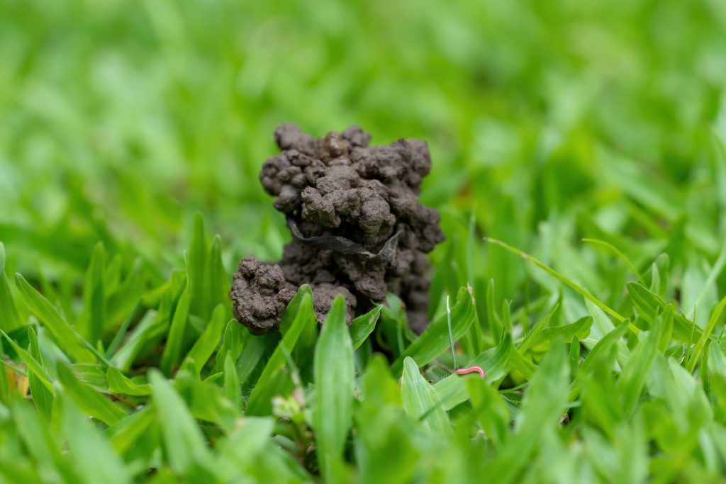 土の表面付近に数mmほどのコロコロとした粒を見かけたことはありませんか? それがミミズの糞です。ミミズは、大量の土や有機物を食べ、細かく分解しながら土中を進みます。ミミズの腸内で練り合わされてできた糞は耐水性のある団粒となって排出されます。水に浸けても簡単に溶けない土団子をイメージすると、わかりやすいかもしれません。