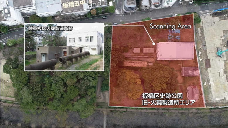 この「陸軍板橋火薬製造所跡」は2017年(平成29年)に国史跡に指定され、一帯を歴史公園「板橋区史跡公園」(仮称)として公開するための整備が進められています。整備にあたってはエリア内の遺構や歴史的建造物の調査・研究が進められたのですが、今回はそこで活躍した測量の技法「3次元測量」についてのお話です。