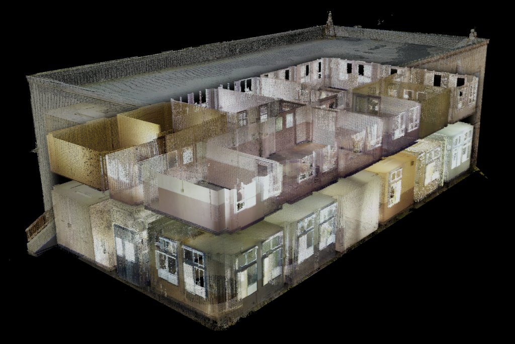 こうして得られたデータをすべて結合すると、スキャンしたエリアの全体像を点群で見ることができました。