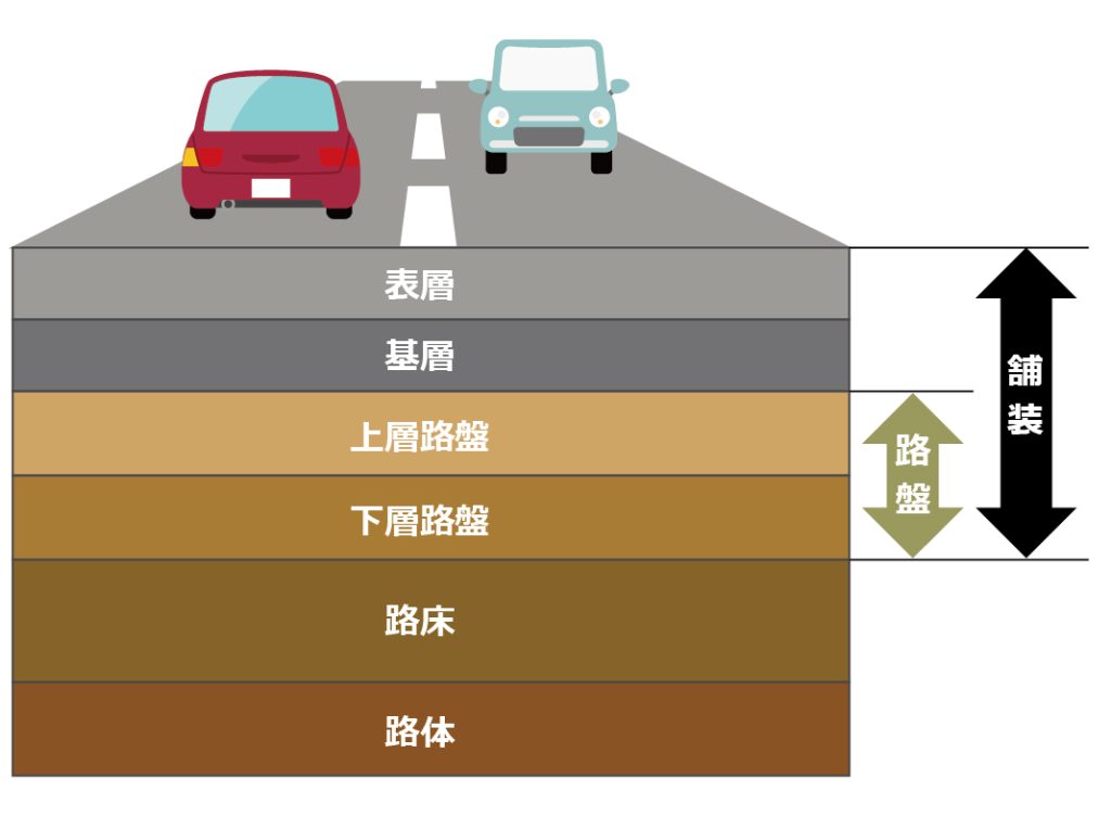 舗装構造を支える地盤のうち、舗装底面からおよそ1m下までの範囲を指します。路床の下部を路体といい、主に土でできた最下層の部分を指します。構造上で交通荷重の分散を高める場合は、原地盤の改良が必要な場合もあります。