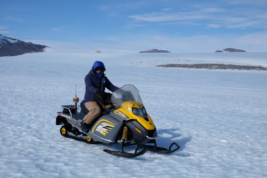 「滑走路の建設予定地だけでなく周辺の山々を含む広大なエリアを効率よく調査するため、「HiPerHR」をスノーモービルに取り付けて、南極横断山地を縦走しました」と語るStilgoe氏。