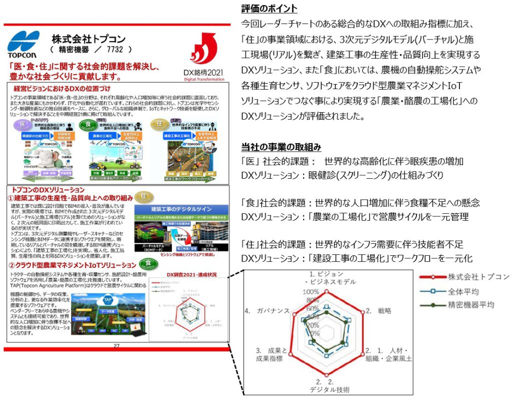 株式会社トプコン(本社:東京都板橋区、代表取締役社長:平野 聡)は、このたび経済産業省と東京証券取引所が共同で選定する「デジタルトランスフォーメーション銘柄(DX銘柄)2021」に、2年連続で選ばれました。